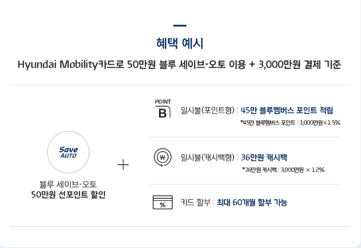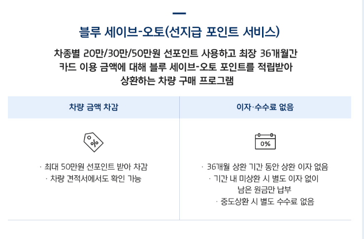 - 블루 세이브-오토: 선포인트 최대 50만원 차량 금액 차감 + 무이자 상환