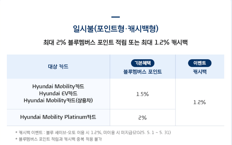 - 일시불 결제 혜택: 최대 2% 블루멤버스 포인트 적립 또는 1.2% 캐시백