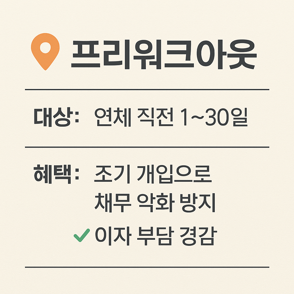 | 프리워크아웃 | 연체 직전 1~30일 | 조기 개입으로 채무 악화 방지, 이자 부담 경감 |