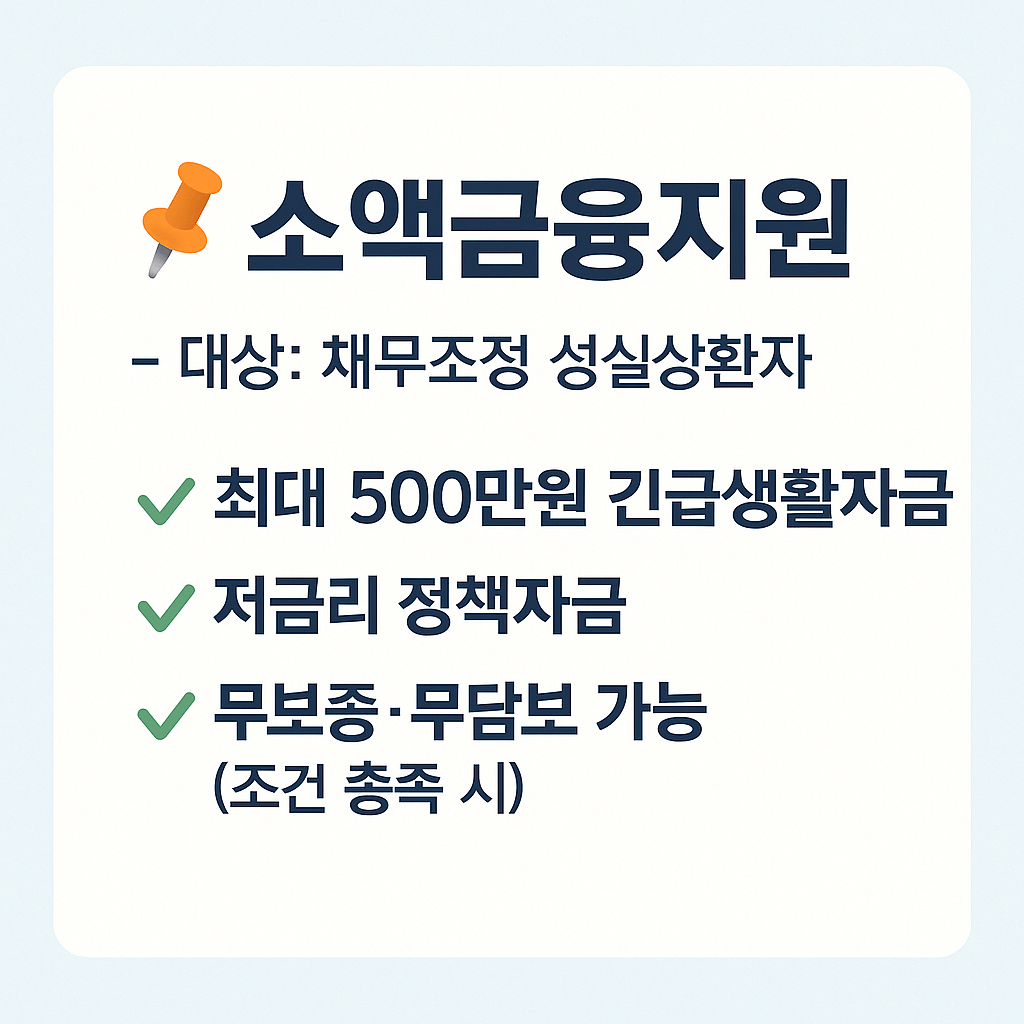 | 소액금융지원 | 성실상환자 | 최대 500만원 긴급대출 지원 가능 |