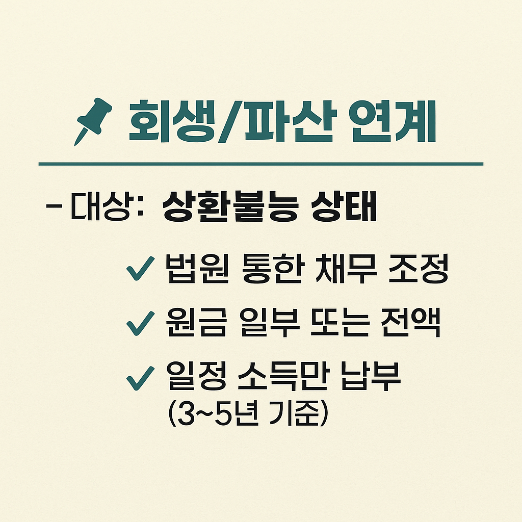 | 회생/파산 연계 | 상환불능 상태 | 법원 통한 조정, 원금 탕감, 일정 소득만 납부 |