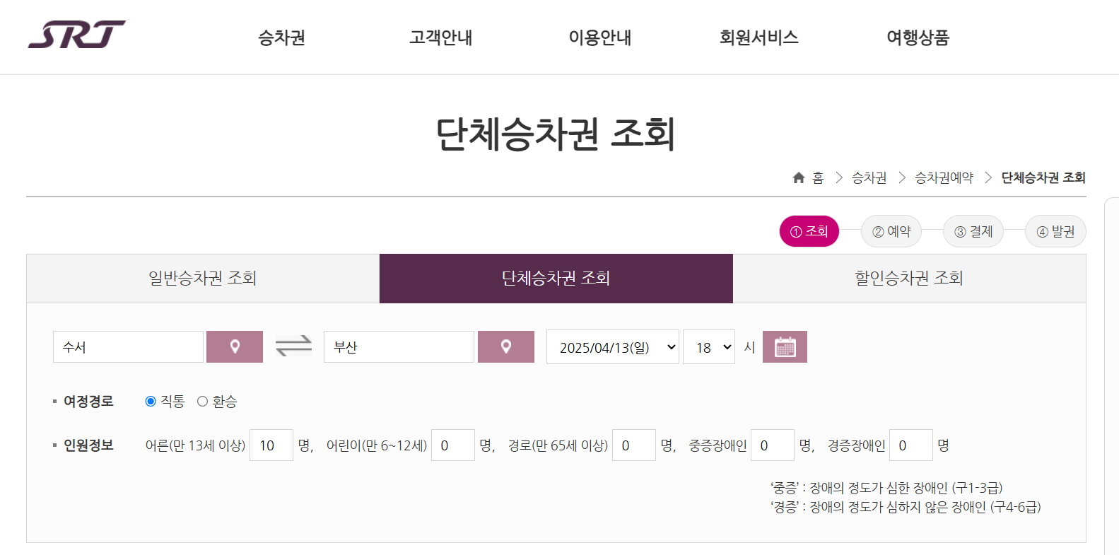 할인 승차권은 SRT 앱과 SR 홈페이지에서만 예매 및 환불이 가능하며, 역 창구나 열차 내에서 변경 시 할인 적용이 취소될 수 있습니다. 이용 인원 등 변경 시에는 기존 승차권을 환불한 후 재구매해야 하며, 이 경우 할인 적용이 제한될 수 있습니다.