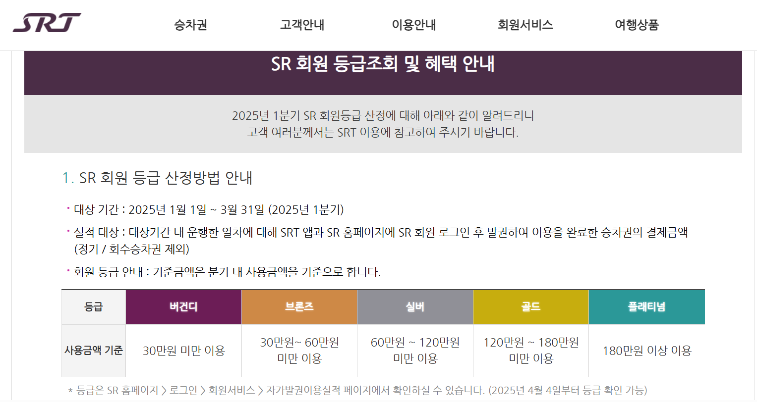 | 청소년 할인 | 13세 이상 25세 미만의 SR 회원 | 10% 할인, 1일 2회, 월 8회 이용 가능 |