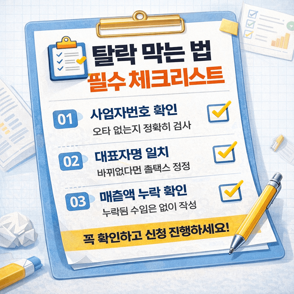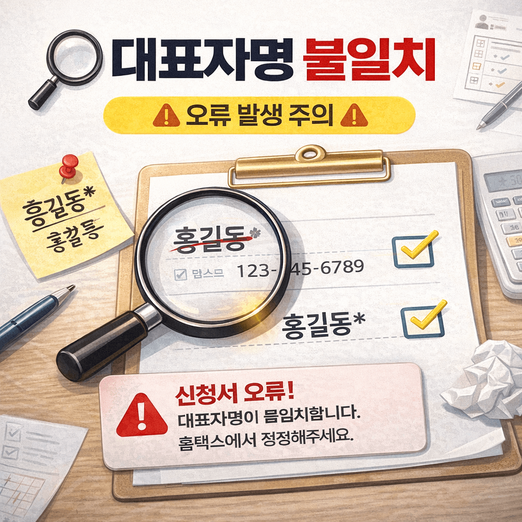 가장 빈번한 오류는 ‘국세청 정보 불일치’입니다. 홈택스 사업자 상태 조회 후 동일하게 입력했는지 반드시 점검해야 합니다.