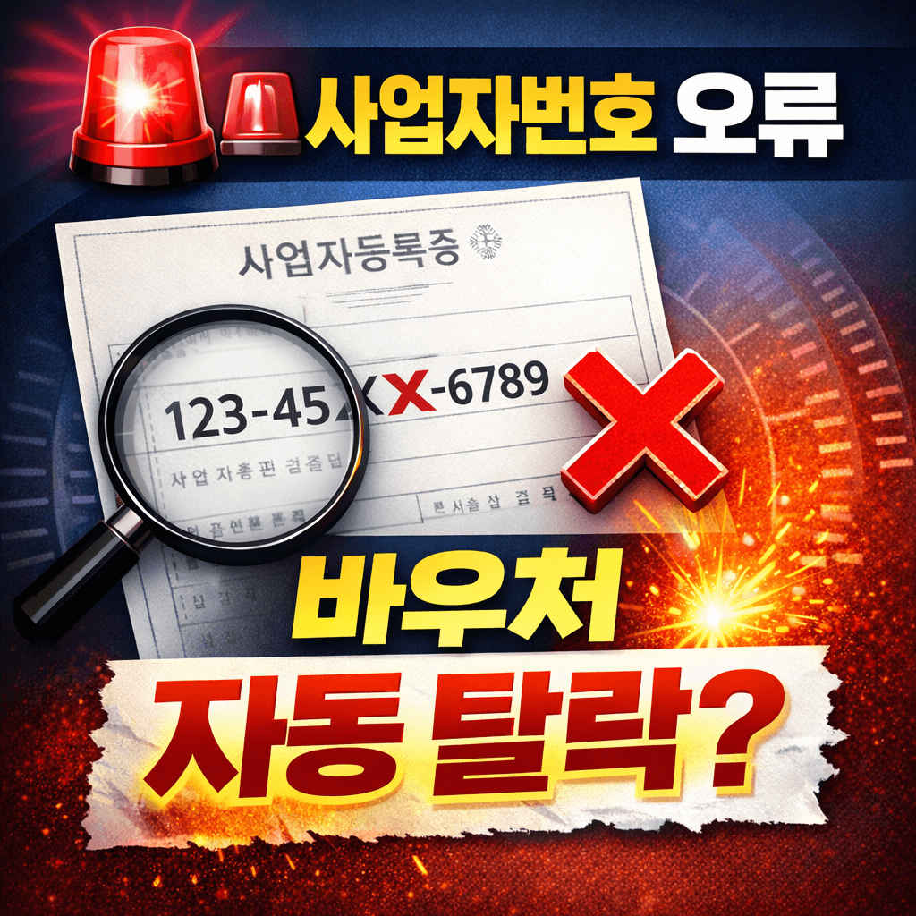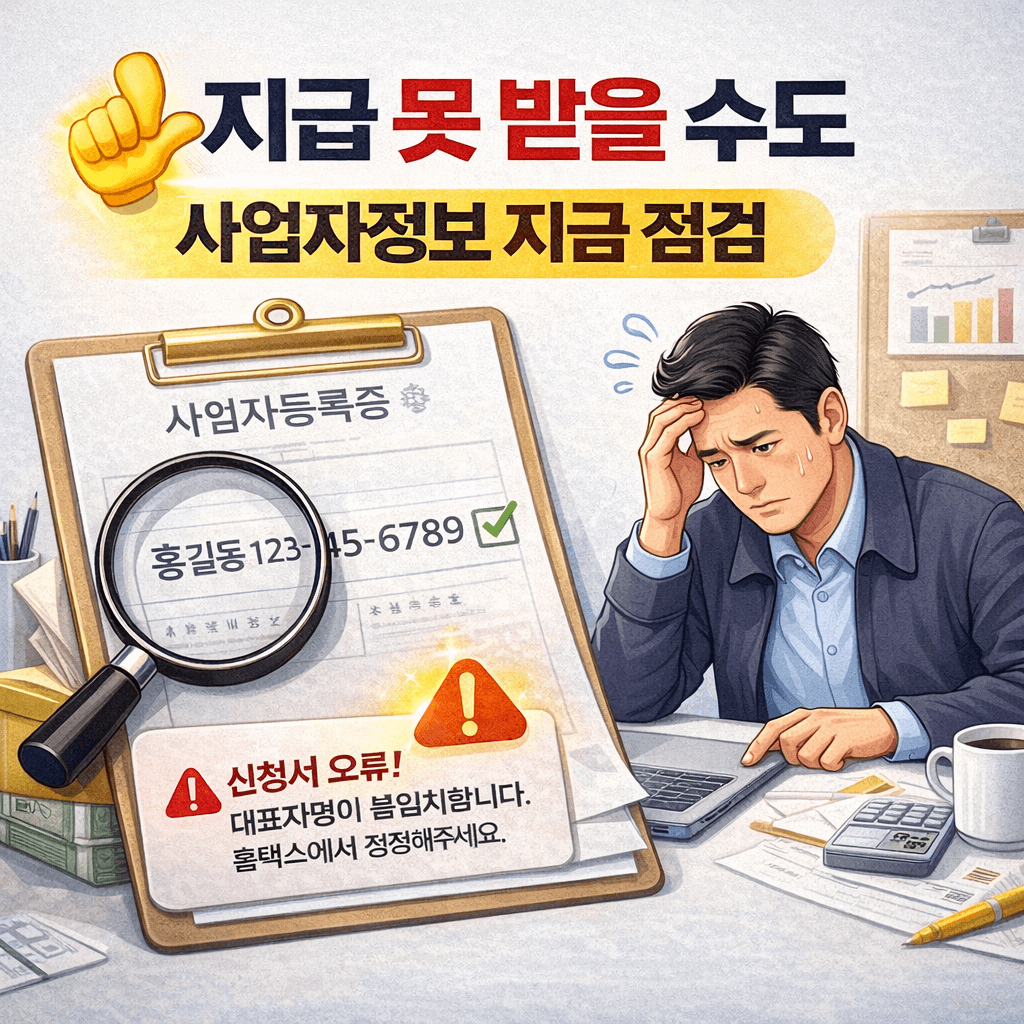 소상공인 바우처 신청 실패의 핵심 원인은 사업자정보 불일치입니다. 신청 전 사업자등록번호·대표자명·상호명·업종코드를 홈택스 기준으로 반드시 대조 확인하시기 바랍니다.