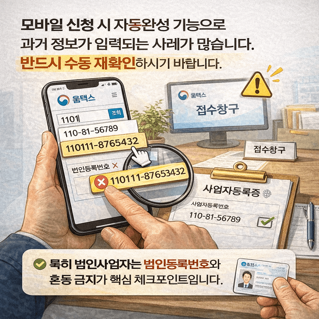 모바일 신청 시 자동완성 기능으로 과거 정보가 입력되는 사례가 많습니다. 반드시 수동 재확인하시기 바랍니다. 특히 법인사업자는 법인등록번호와 혼동 금지가 핵심 체크포인트입니다.